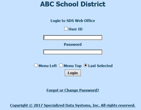 If your current web address is something like this: https://ssl12./sdsschooloffice.com/schoolname/sdsweboffice