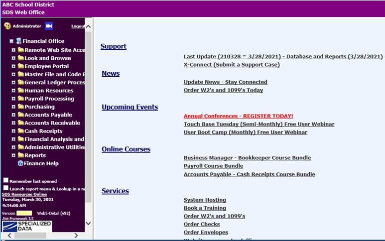 When logging into your SDS Finance system you may need to change your URL or web address to see the Menu Left and Menu Top options.