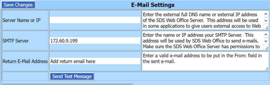 If you are successfully using email features in the SDS program,then you don’t need to make any changes to your email settings. For those who are hosted by SDS and are not setup to send emails, you will need to enter the SMTP server and Return Address into the Email settings area. You can get to the email settings area as follows: