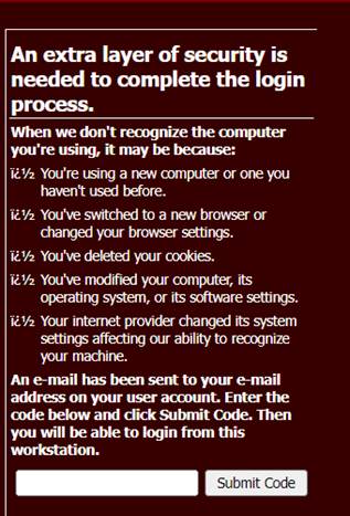 •When the user clicks on the “Login” button, then the screen below will display with the following message, “An extra layer of security is needed to complete the login process”.