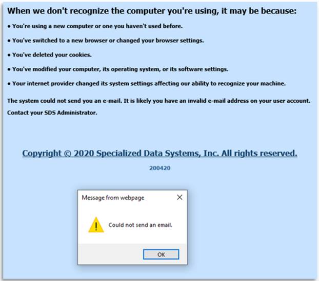 If a user tries to login and does not have a valid email address, the message below will display. If this happens, then the email address of that user will need to be added/updated. The user should close their browser, then re-try once the email has been corrected.