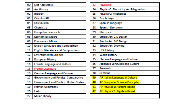 Advanced Placement Course List--Advanced Placement Courses should be reported for any student that completed any of these courses during the entire school year. Participation can occur during first semester, second semester, or both. If a student signs up for but does not complete the course, do not report that course.