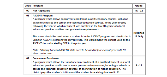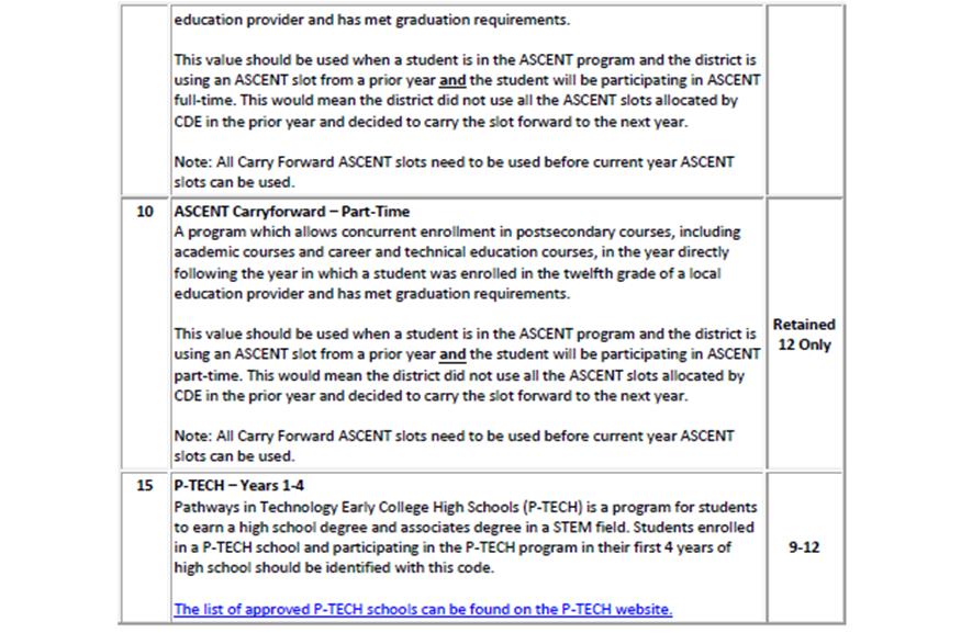 •Report postsecondary course participation in the semester during which the participation took place. If a course spans multiple semesters (i.e. a year-long class), report program participation in both semesters. If your district operates on a trimester or other nontraditional schedule, you will need to make a determination regarding which semester (1st or 2nd) you will assign postsecondary participation to, then consistently apply this determination for all Post-Secondary Program students.