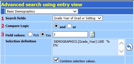 o For example, if Grade Year is selected as the field and 2 is keyed in Field values, the system will look for values “like” 2. So, if there are field values of 02 and 12 used in the Grade Year field, students with either of these field values will be displayed.