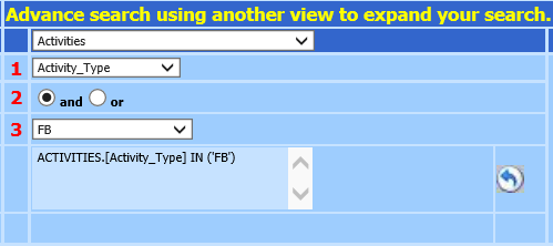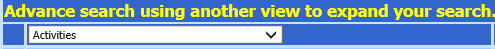 This screen can be used to add additional search criteria from another data view. For example, if you want to view 9th grade students, who are participating in football, set up a search for Grade Year 09 in the advance search box on the left and then set up a search for the football activity in this search box.