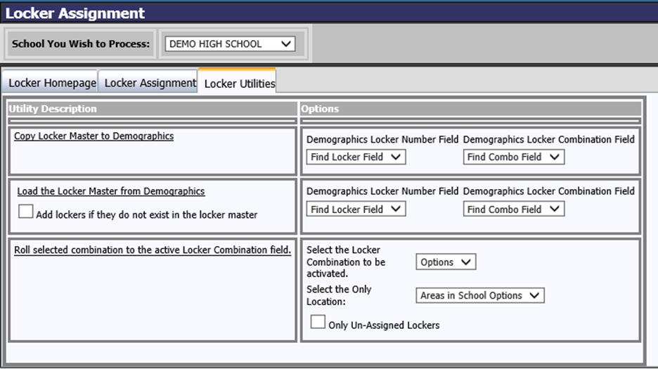 o Use the utility available under the “Locker Utilities” tab to synchronize the student demographics area with the locker area. For instructions, click here: