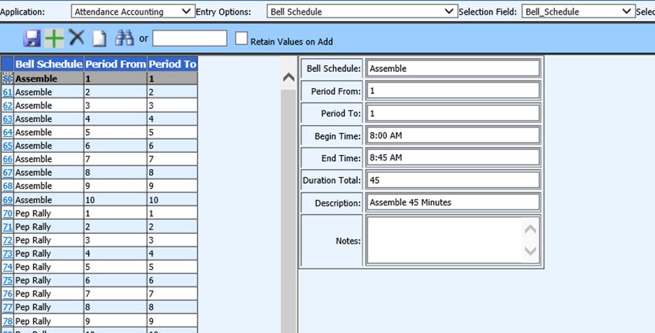 2. To set a Bell Schedule for Attendance, first enter Data Entry and Changes |Master File Entry and Changes |Entry Options |Bell Schedule. Some sample bell schedules for a 10 period day have been set up. Simply modify one of the supplied schedules to meet your district needs (i.e. edit the periods and times for your school).