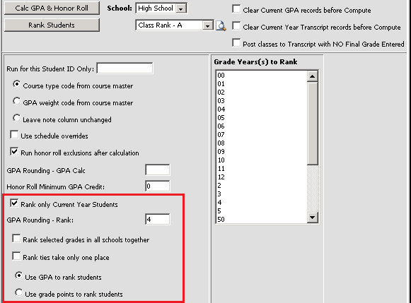 o GPA rounding – Rank: Enter the number of decimal places (1-4) to be used in rounding the GPA values for class rank.