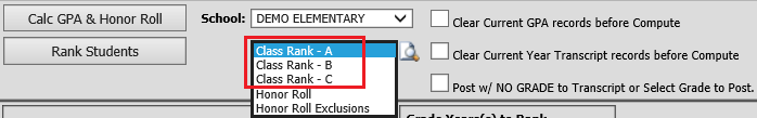 o Rank selected grades in all schools together: If checked, students in different school locations BUT in the same grade are ranked together as if they were one group in the same school. This option is usually left unchecked.