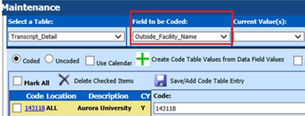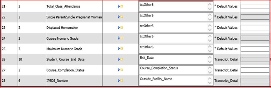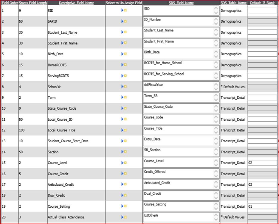 The IPEDS code can be added into the coursemaster Outside_Facility_Name field. When a GPA compute is done, the IPEDS code will be tranferred into the transcript’s Outside_Facility_Name when final grades are computed. Match the state’s field #28 IPEDS Number field to the SDS transcript_detail field, Outside_Facility_Name