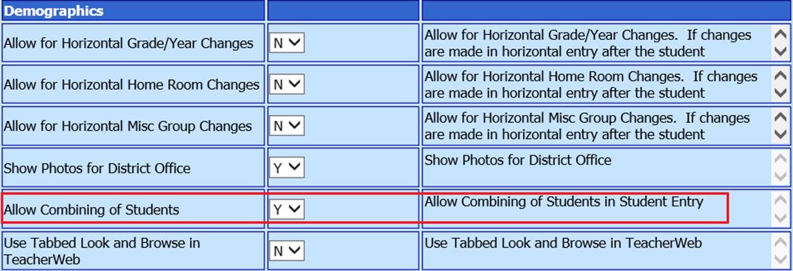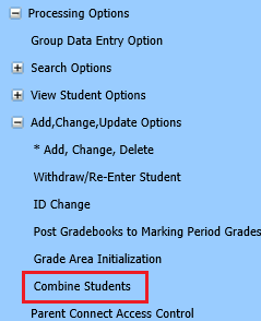 In Data Entry & Changes|Student Information|Processing Options|Add, Change, Update Options, this option allows for combining duplicate student records entered with different id numbers. NOTE: If trying to combine a student who used to be a student in your school but left while in a different school location, you MUST be able to see ALL school locations in order to combine the student's records.