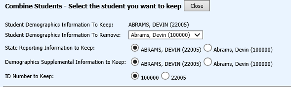 The grid displays using the selected demographics view. Select the student record you wish to keep, which supplemental and state reporting information to keep, and which ID number to keep. If there are more than 2 duplicates, they will be in the dropdown to pick.