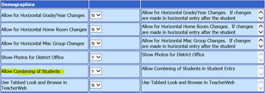 In Data Entry & Changes|Student Maintenance|Processing Options, this option allows for combining duplicate student records entered with different id numbers.