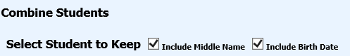 Selecting the Combine Students option will display a list of duplicate students in your database. The initial grid displays duplicates based on last/first/middle/birth date. You can uncheck middle name and/or birth date to remove them from the filter, if desired.