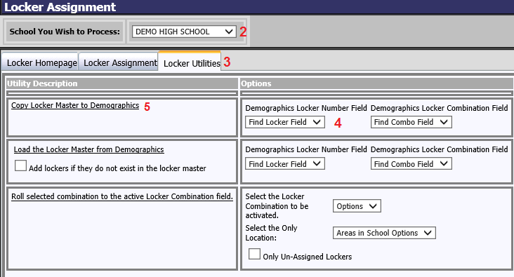 4. To the right of Copy Locker Master to Demographics under the “Options” area, choose the appropriate demographics locker number and locker combination fields.