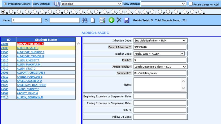 Delete records in other Data Entry & Changes|Student Information Entry Options such as Activities, Discipline, Transcript Detail, etc. following these instructions: