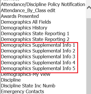 Demographics Supplemental Info can be added to students in Data Entry & Changes in either the Student Maintenance or Student Information screens. Custom data entry views are available in both areas. Records added in either area will be available in the other area, as well. Instructions for adding Demographics Supplemental records in both areas are included below.