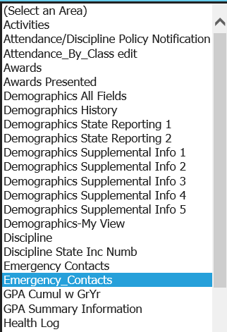 •In this example, custom fields were added to the Demographics Supplemental Info 3 table for emergency contact information and a custom view named Emergency_Contacts was created. Fields were added to the Demographics Supplemental Info 4 table to keep track of student awards and a custom view named Awards was created.
