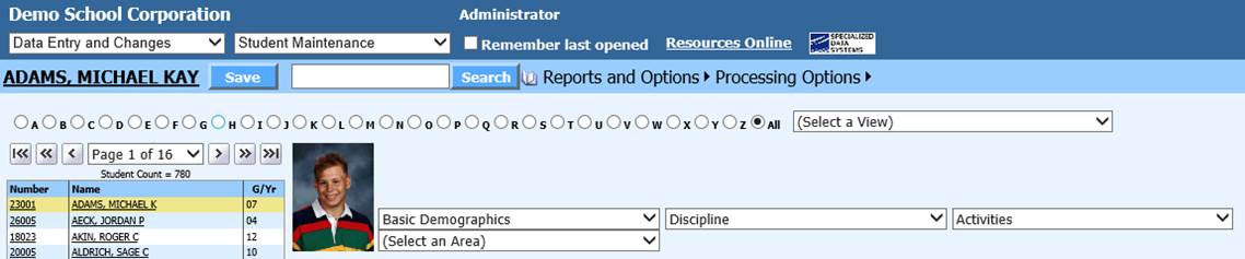 In Data Entry & Changes|Student Maintenance|Processing Options, selecting this option will display the student photo. Once this is turned on, the photo display will stay on until the option is turned off. It is not necessary to turn it on every time you enter the Student Maintenance page.