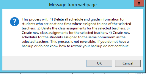 •Click on the Create Student Schedule and Teacher Assignments button. You will receive the following warning message.