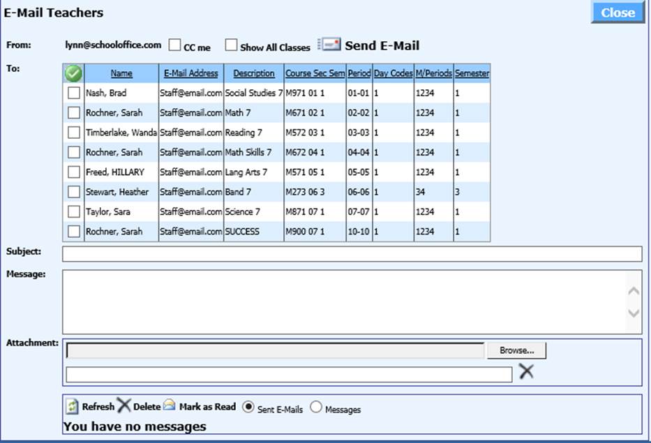 In Data Entry & Changes|Student Information|Processing Options, the E-mail Center option allows the user to select teachers from a student’s schedule and send an e-mail to those teachers. Clicking the E-mail Center option will open this screen: