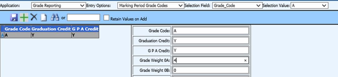 grade weight. Fields are available the marking period grade codes setup in
