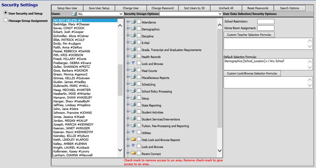 This is the original user security version found in the Administrative Utilities area of the Web School Office menu. This area allows you to easily add or adjust users and group security for the program applications, views and reports. Security options display in “tree” format. Items in the tree are check marked to remove access to those items from users.