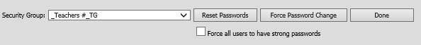 This button will open this screen allowing you to Reset Password, Force Password Change, and Force use of strong passwords for all users in the selected Security Group. For detailed instructions on using these options, Click Here