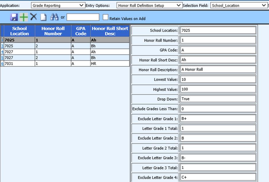 6. Honor Roll Number = Assign a number value to Honor Roll (e.g. Honor Roll 1, 2 3, etc.). Each location that will run honor rolls should have their honor rolls defined. Each location can use honor roll numbers beginning with 1 then 2,3 etc..