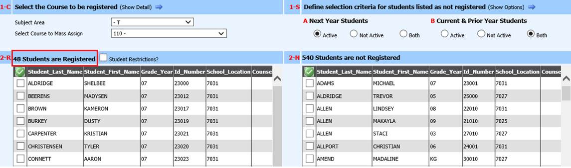 •In the Next Year Mass Registration by Course Area, click on the course in 1-C. The students & count are displayed for the chosen class next to 2-R.