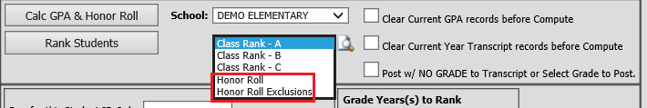 •Make sure all appropriate boxes are checked including the check box for “Run honor roll exclusion after calculations”.