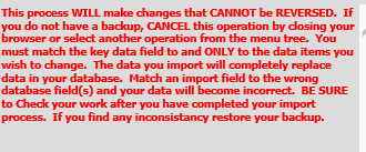 The Web School Office program provides a utility to easily import data from a CSV or TXT file into your database. Prior to using this area, it is very important to confirm you have a current database backup.