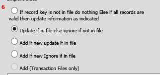 If record key is not in file do nothing. Else if all records are valid then update information as indicated: if record key is not in file do nothing, one wrong ID and the entire import will be aborted. Update if in file else ignore if not in file: If wrong ID numbers are found, they will be ignored and the data for correct ID numbers will import.