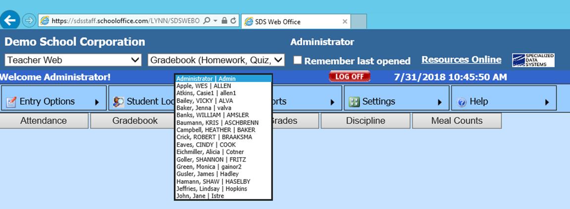 7. When the substitute teacher logs into Teacher Web, a drop down box will be displayed at the top of the screen with the linked teacher names listed.