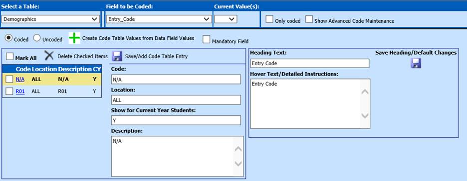 o If a coded field is chosen, a list of codes and descriptions will display. If the field is not currently coded, a blank code, school location and Description screen will display.