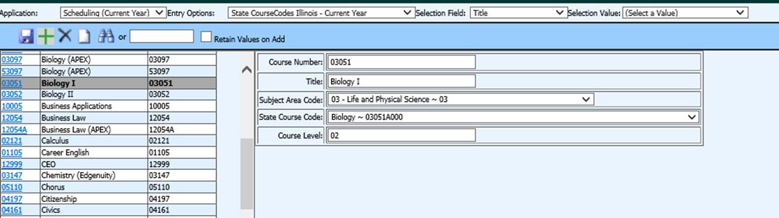 •Each course code should also have a course level (rigor level) assigned. This can be entered from menu Master File and Code File Entry and Changes, Application “Scheduling (Current Year)”, Entry Option “State CourseCodes Illinois-Current Year”. This entry option applies to Michigan as well as Illinois codes.