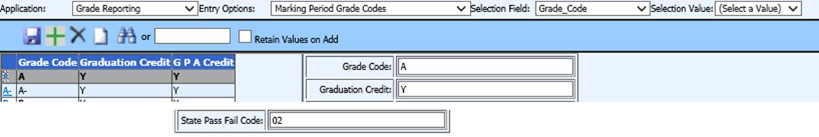 •Enter the course completion status for each letter grade. Use menu Master File and Code File Entry, Application “Grade Reporting”, Entry Option “Marking Period Grade Codes”. The code is entered in the State Pass Fail Code field.
