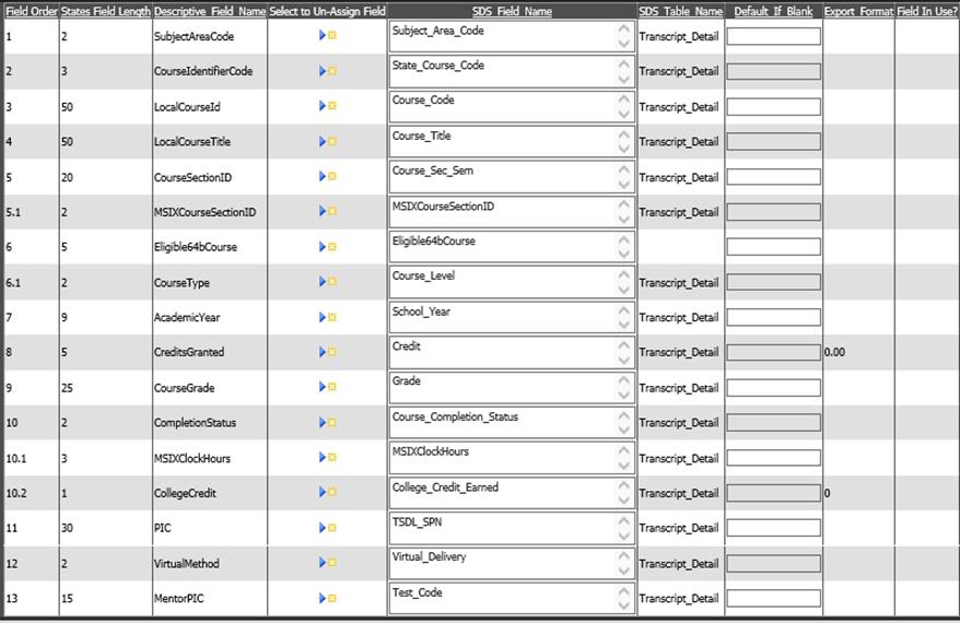 o The following fields (from subreport layout MSDS TSDL-StudentCourse) are reported for each course in transcripts for the current school year.