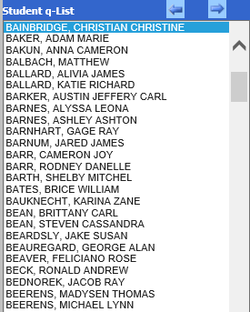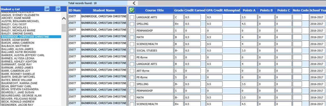 For example, in the screenshot below of the Transcript Detail data entry view, the q-list was opened and Christian Bainbridge was selected in the q-list on the left. The screen displays only Christian’s 18 transcript detail records.