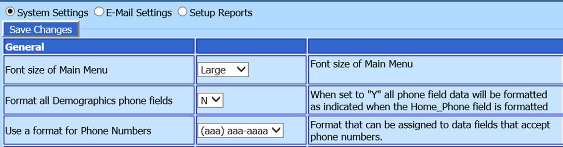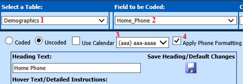 NOTE: If you chose Y on the Format all Demographics phone fields setting in SDS Web Office Settings in the Step 2 instructions above, select the Home_Phone field in #2. After completing steps 3 & 4 and saving your changes, the selected format will be applied to all Demographics fields containing the word phone.
