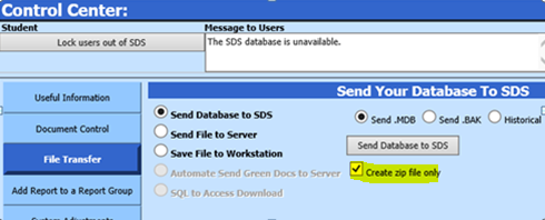 3. Put a checkmark in the “Create zip file only” box. Click on the “Send Database to SDS” button. This will take a minute or two to create a zip file named “ToSDSFile.zip”. Once it is complete you will get a message indicating that your file is complete and ready for download.