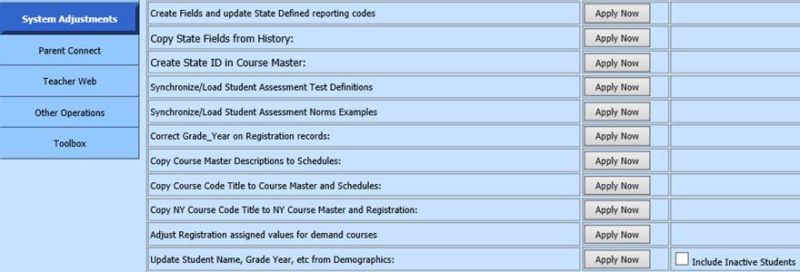3. Scroll down to “Update Student Name, Grade Year, etc from Demographics”. Check “Include Inactive Students” and click on the “Apply Now” button to the right. When it is finished you will get a message letting you know how many records were updated.