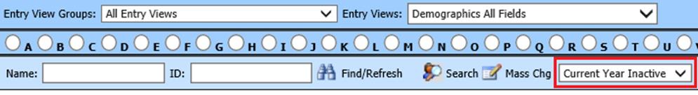 3. Go to the drop down box to the right of the “Mass Change” icon. Choose to view “Current Year Inactive” students. This will include students who finished the school year and students who withdrew during the current school year.