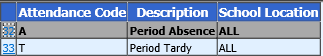 In this area, you will set up records indicating how many periods of absence constitute a half day absence for students and how many periods of absence constitute a full day absence for students. These records are set up by school location and if necessary by grade year and day code.