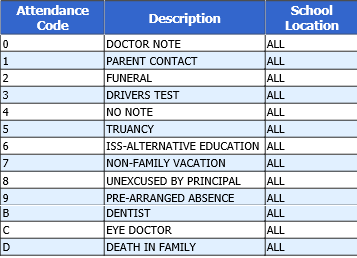 Additional codes can be added in this area to provide reasons for absences. These codes can be entered on either Period or Daily Attendance absences. Codes added in this area are one character (alpha or numerical) and no codes should be duplicated that are already being used in any of the other attendance code areas described above. Below are examples of possible Attendance Other Codes.
