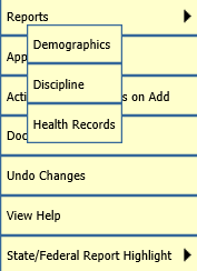 In this screenshot, clicking on the Reports option lists Demographics, Discipline & Health records because those are the data entry views currently open on the Student Maintenance screen. Click on the desired report to display & print that report for the selected student.
