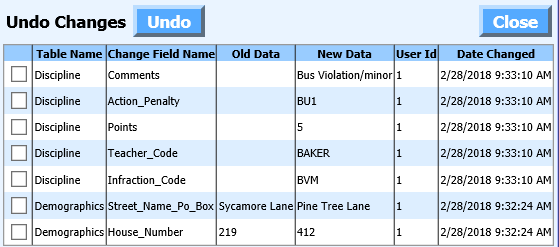 Checkmark the changes you wish to undo and click the Undo button. The old data will be restored to the fields selected.