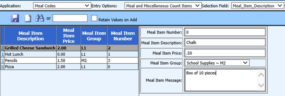o Meal Item Price: Enter if applicable; for example, class elections may not have a price or water may be 1.25.
