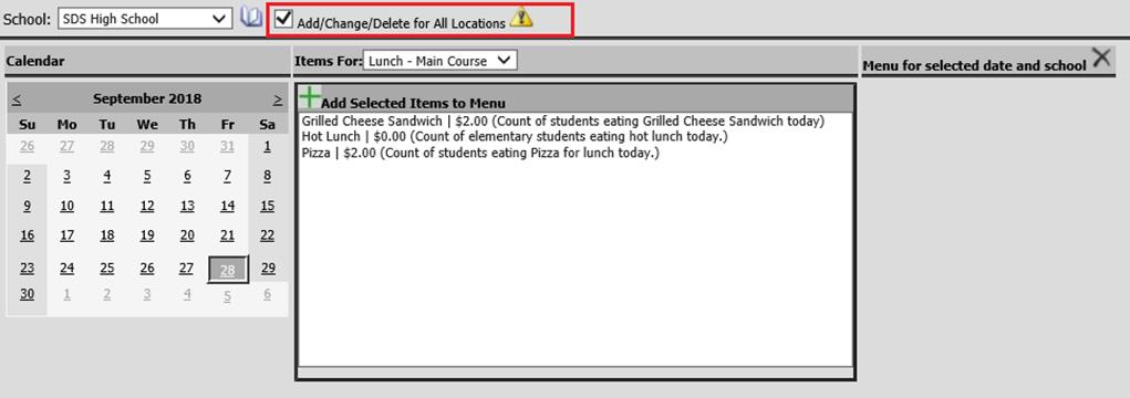 Note:  If all locations will have the same menu setup you can manage the menu planner for all locations. Put a check in the box titled “Add/Change/Delete for All Locations”