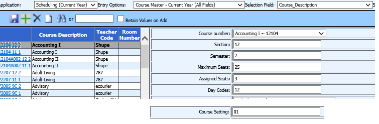 •A course setting must be included on the course master. This can be entered from menu Data Entry & Changes |Master File and Code File Entry, Application “Scheduling (Current Year)”, Entry Option “Course master – Current Year (All Fields)”.